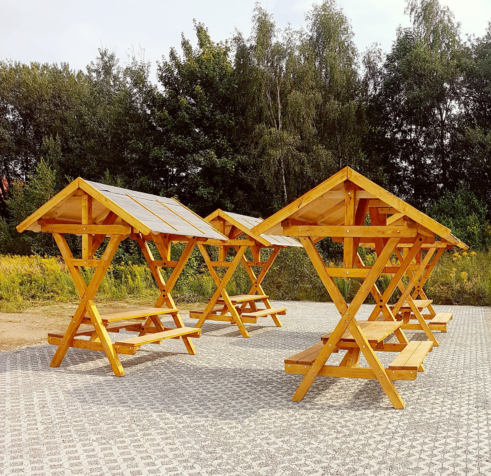 Auf Campingplätzen, in Schulen und Kitas lädt die überdachte Sitzgruppe zu Mahlzeiten, kreativen Aktivitäten oder geselligem Beisammensein ein.