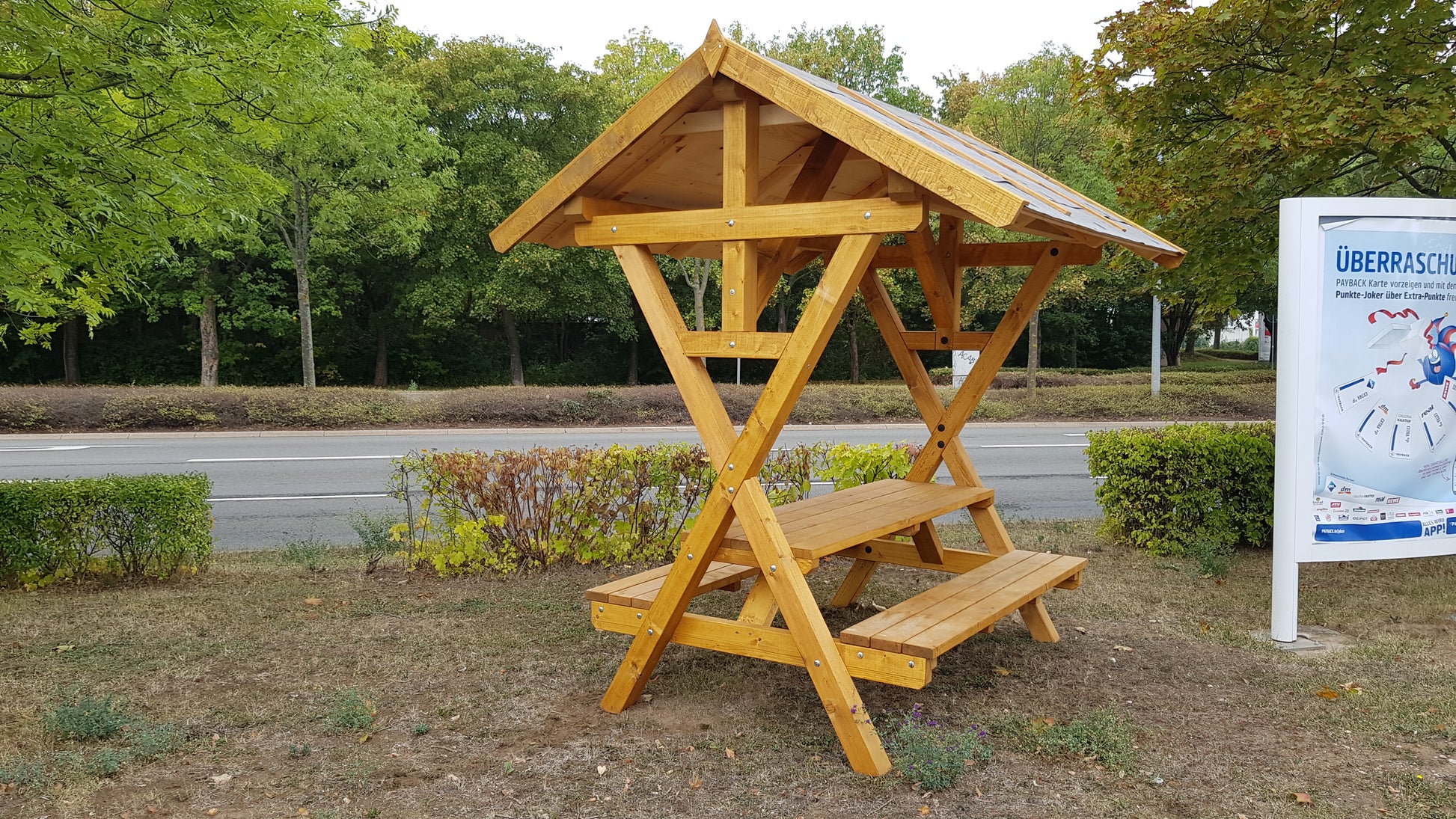 Diese Sitzgelegenheit eignet sich ideal für Unternehmen, Campingplätze, Schulen, Kitas und Gemeinden – sei es als überdachte Raucherzone oder als Pausenmöbel mit Dach. Unternehmen jeder Größe schätzen diese Sitzgruppe für ihre Mitarbeiter.
